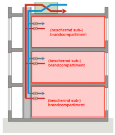Vaak zijn appartementen voorzien van een mechanisch ventilatiesysteem, waarbij de toe- en afvoerkanalen zijn aangesloten op een gemeenschappelijke verticale leidingschacht. Deze schacht kan overeenkomstig het Bbl worden beoordeeld als ruimte welke buiten een brandcompartiment moet zijn gelegen. Op basis hiervan geldt er formeel geen WTRD vanuit een appartement richting de leidingschacht, maar enkel tussen de appartementen onderling.